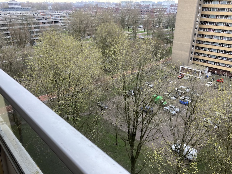 De iepen hebben nog twee verdiepingen te gaan. Nu al strekken hun toppen zich reikhalzend uit naar de onderrand van het balkon. Dat was zes jaar geleden nog anders, toen wij hier kwamen wonen.
